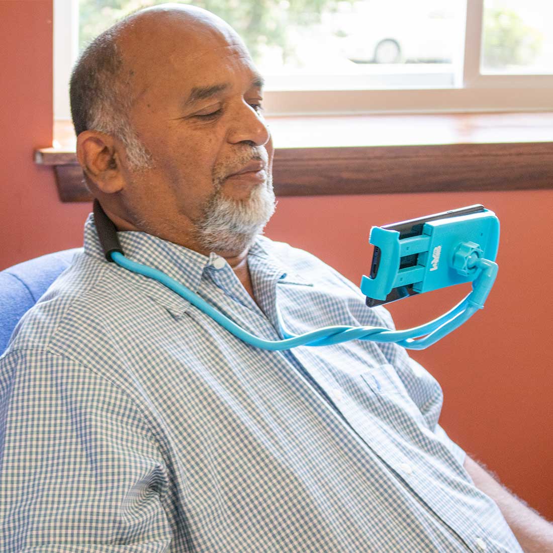 Put your phone in between the spring loaded clamps. The clamps should automatically and securely close to hold your phone in place. Once your phone is secure, you can place the Watch Your Back around your neck to hold the phone a comfortable viewing distance from your face. You can also bend the stand and place it on any solid surface to make it a multi-angle phone stand. Since the Watch Your Back is flexible, you can also wrap it around a solid round or square bar.